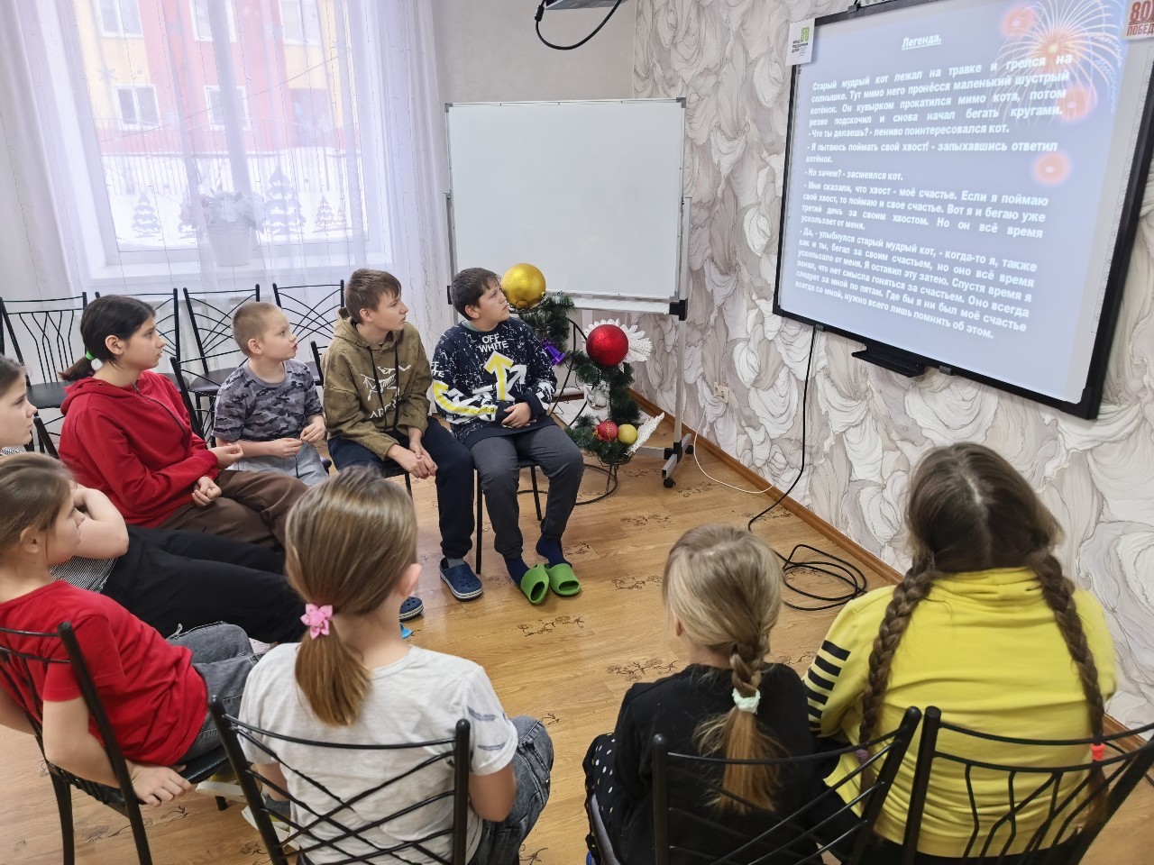 Занятие началось с ответов детьми на вопрос «Счастье – это…?» и прослушиванием притчи про старого мудрого кота и котенка, который гонялся за своим хвостом и считал его своим счастьем. Главный вывод этой притчи, что где бы мы ни были, наше счастье всегда с нами, нужно всего лишь помнить об этом.