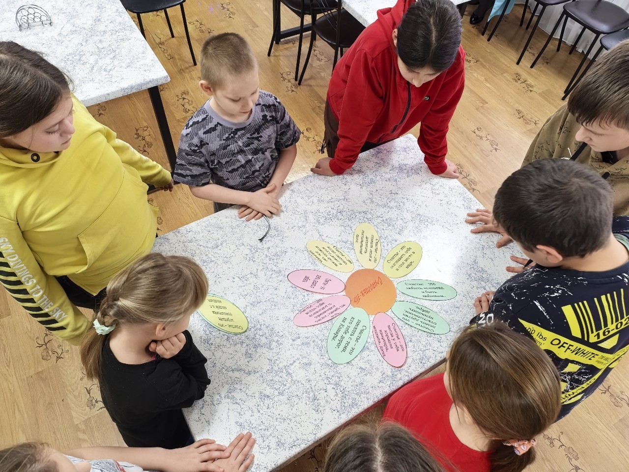 Следующим этапом занятия было творческое задание «Цветок счастья». Воспитанники познакомились с такой наукой о счастье, как «феликсология». В соответствии с выводами ученых, существует 12 характеристик счастья. Каждому ребенку к сердцевине цветка с надписью «Счастье - это...» надо было выбрать и приклеить лепесток с надписью, что такое счастье.